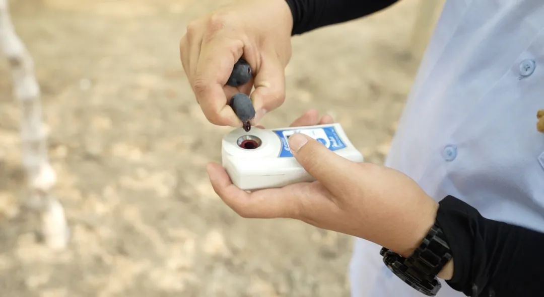 “早熟葡萄上市的标准是底糖可溶性固性物达16度及以上,现在我们将套袋摘去,拆袋后的葡萄使其充分光照,从而更好地积累糖分。”上海马陆葡萄研究所副所长单文龙现场摘下一颗马葡1号果实进行糖度测试,结果为18.3度。