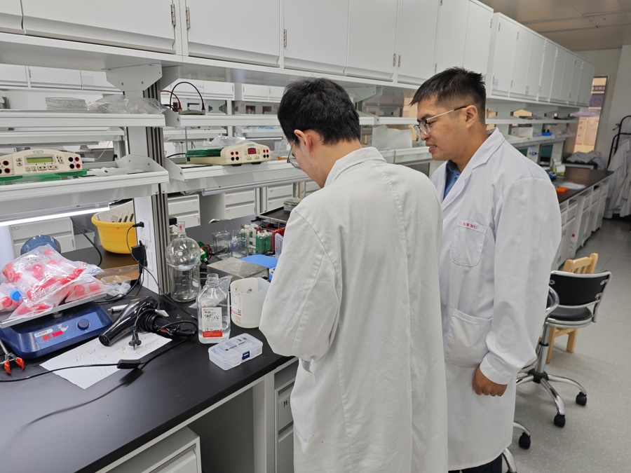 倪大龙(右)指导研究人员做实验。 吴越摄