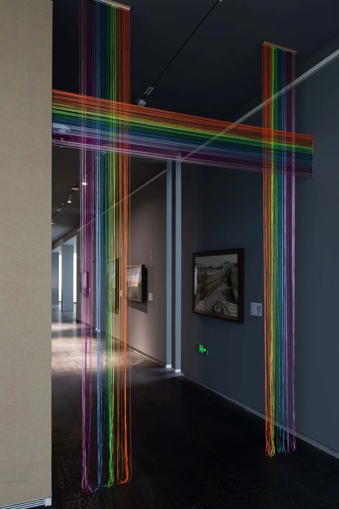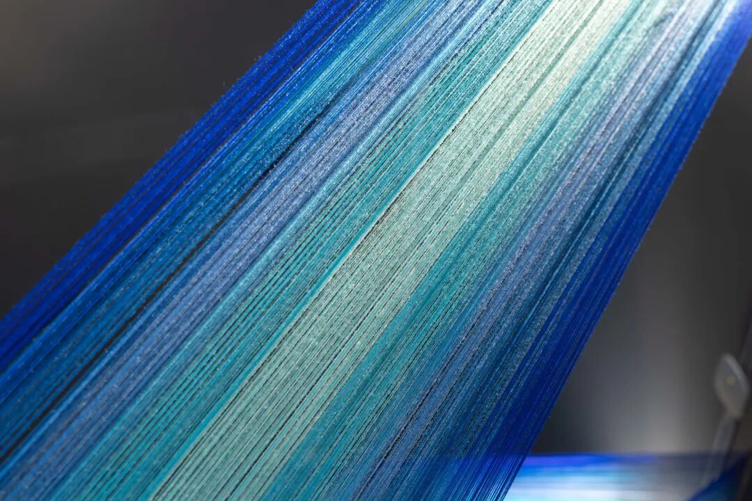走进展厅,映入眼帘的蓝色装置作品以线为核心媒介,无数束纯净的蓝色线条,如同瀑布般轻盈垂落。装置的形态将单一色调化为流动的、可感知的氛围,让观众仿佛步入一片蔚蓝的梦境,直观感受绒线在静谧中流动、在宁静中苏醒的生命力。