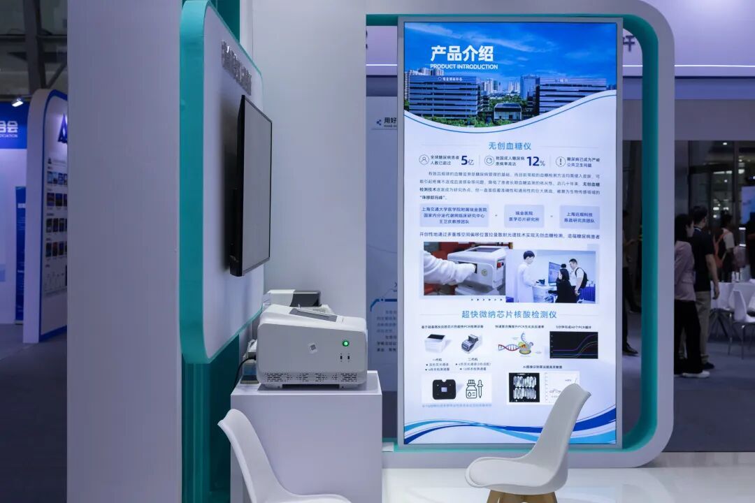 上海交通大学医学院附属瑞金医院医学芯片研究所展示了由陈昌研究员团队和上海交通大学医学院附属瑞金医院王卫庆教授团队合作自主研发的无创血糖仪。此外,还有超快微纳芯片核酸检测仪等高端医疗器械在会场展出。
