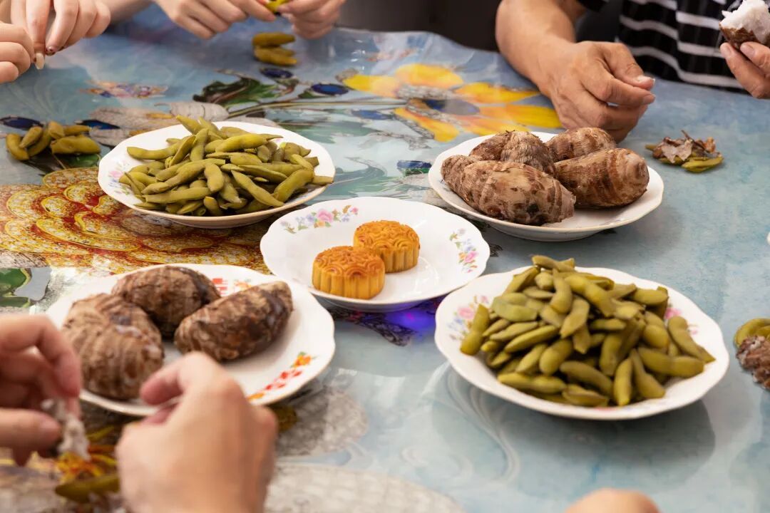 走进彭赵村的一户老宅,一眼便看到那座占据一角、由斑驳砖石砌成的大灶台,灶膛内跳跃的火焰将熄未熄,无声地诉说着过往无数个节庆的热闹。灶台旁的桌上,两盘刚出锅的毛豆与芋艿正氤氲着温热的白汽。豆荚碧绿,芋头饱满,与一旁象征团圆的两枚月饼一起构成了这个特殊中秋夜里的温馨风景。这看似朴素的两样小食,却是桌上绝对的主角,串联起几代人关于中秋的共同记忆。